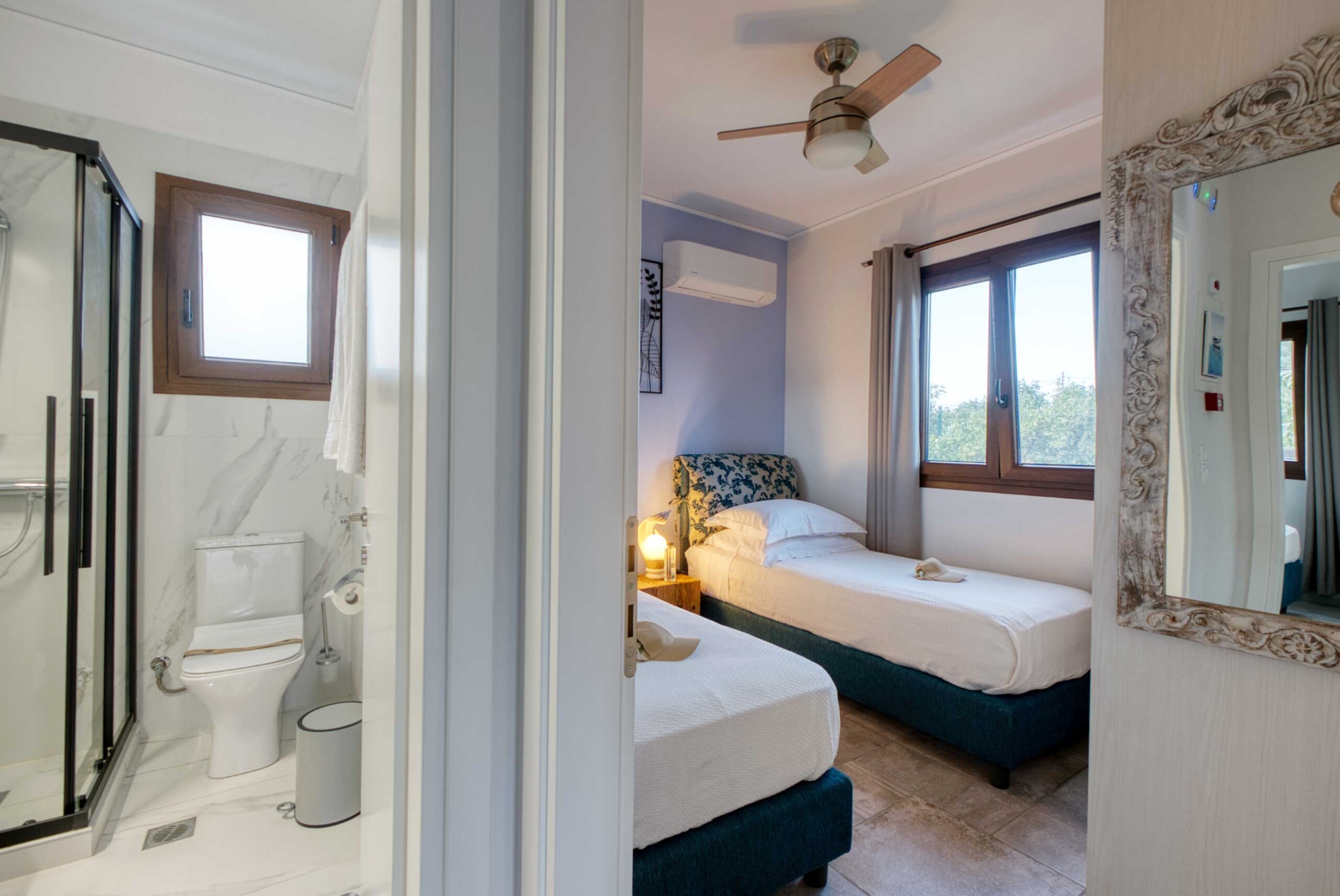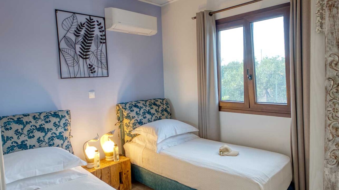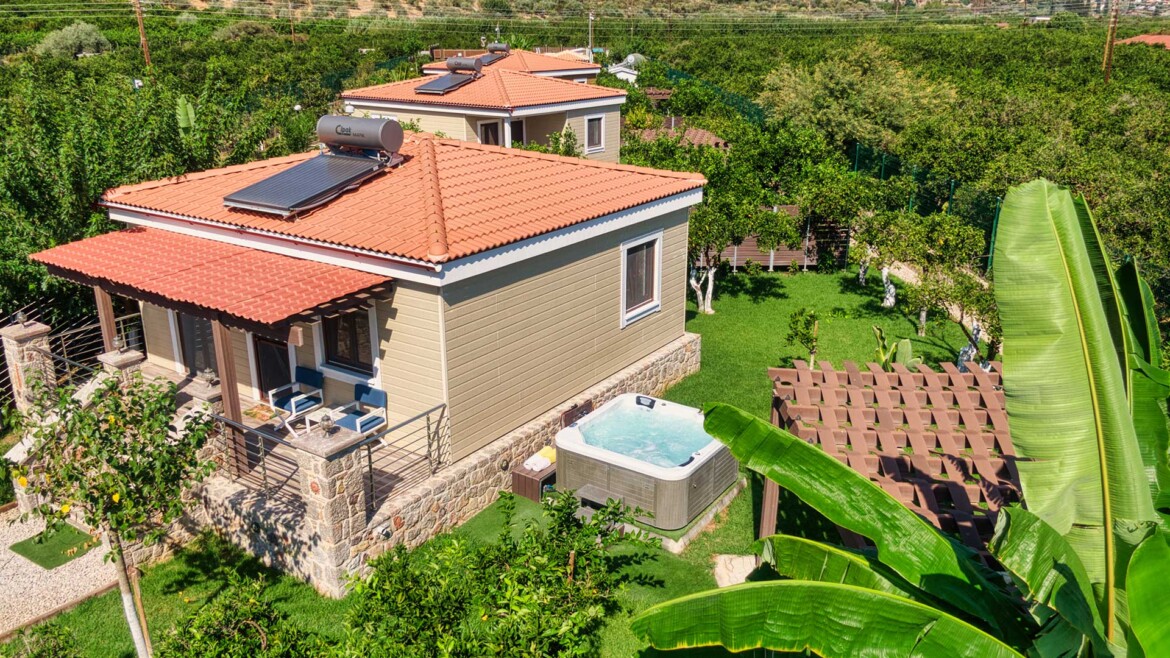 50sq.m. two-bedroom house with spacious living room and a fully equipped kitchen. Bathroom is equipped with a hair dryer, heated mirror and luxurious amenities. All rooms have A/C and ceiling light with fans. It offers outdoor barbeque and sitting area surrounded by our orange trees as well as an outdoor jacuzzi that can take up to 5 people.
